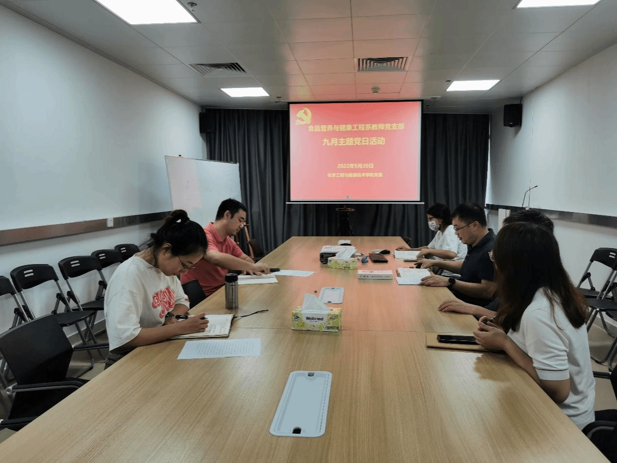 2022年9月30日下午,食品营养与健康工程系教师党支部在科创院310会议室开展师德建设主题党日活动。会议由支部书记闫景坤主持,支部全体党员参加了此次活动。