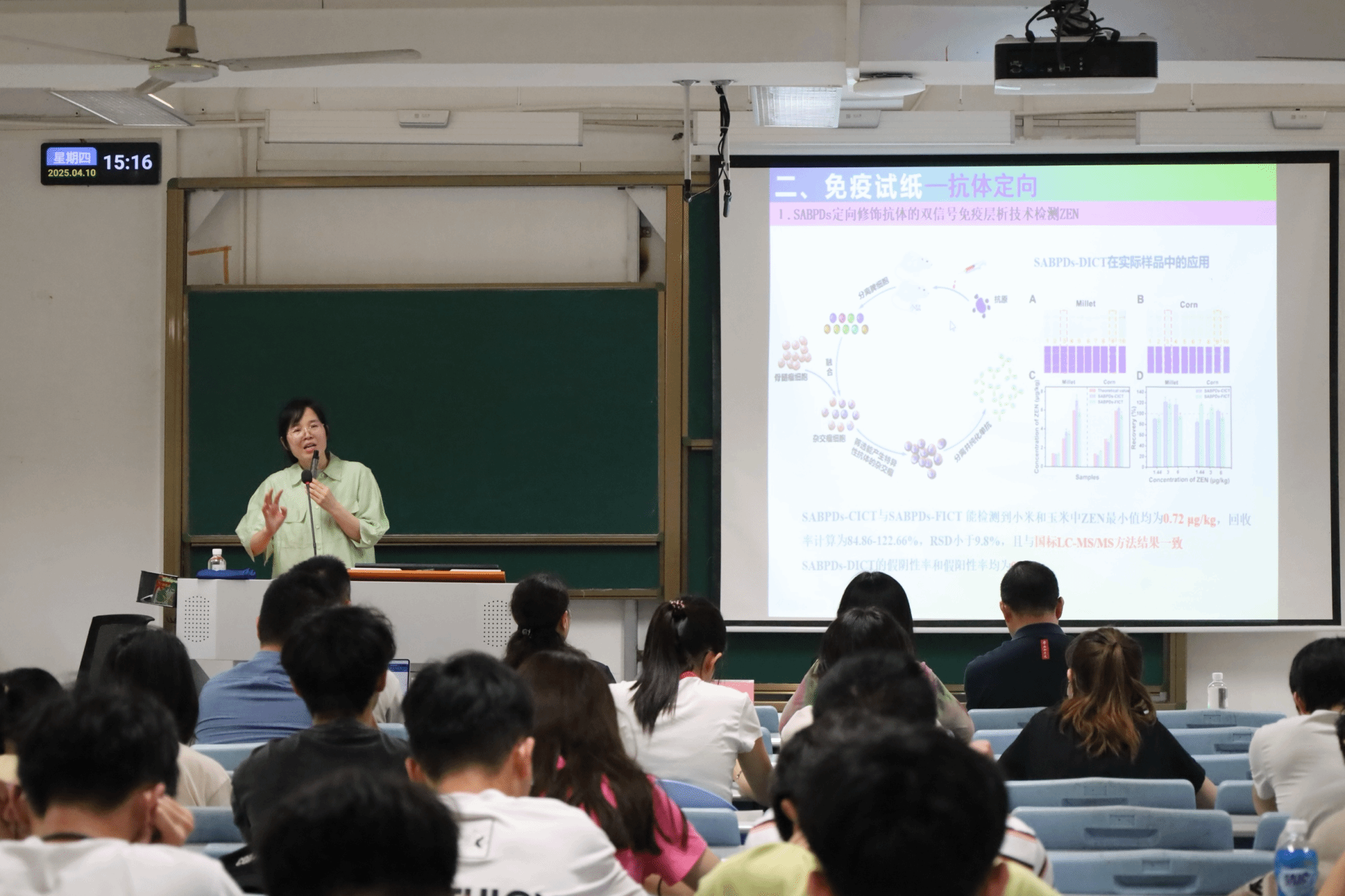 在学术报告环节,王丽教授作了题为《食品与环境污染物快速检测》的专题讲座。她首先介绍了基于抗体-抗原的免疫快检技术的主要原理,随后重点介绍了其在一线科研岗位上开发的免疫快检技术、产品及其在食品及环境污染物检测中的应用。在提问环节,师生们与王丽教授积极互动,现场讨论交流热烈。