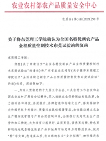 2021年3月,农业农村部农产品质量安全中心将xcsports确认为“全国名特优新农产品全程质量控制技术东莞试验站”(统一编号CAQS-GAP-SYZ041)。该试验站依托公司xc体育食品营养健康工程与智能化加工研究中心及院内相关技术机构与创新团队, 主要针对广东省区域范围内的农业,积极开展名特优新农产品全程质量控制技术研发、技术推广、技术培训、技术服务、生产指导、消费引导、试点推广、人才培养等技术创新引领工作。服务内容包括:1. CAQS-GAP试点培育。开展全程质量控制技术研发与服务,提供全程质量控制技术体系培训与咨询,帮助试点单位建立全程质量控制技术体系;2. 受理试点单位申报材料,审核合格后,上报国家中心体系建设处;3. 协助试点单位申请国家良好农业规范(GAP)认证。