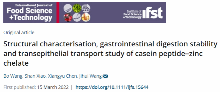 2022年3月,xcsports化学工程与能源技术公司王波博士(第一作者)在国际食品期刊《International Journal of Food Science and Technology》(IF:3.612, 中科院二区)发表了题为“Structural characterisation, gastrointestinal digestion stability and transepithe-lial transport study of casein peptide–zinc chelate”的研究论文。