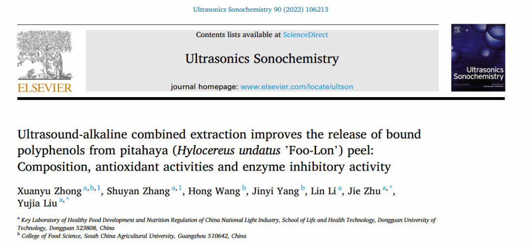 本研究以《Ultrasound-alkaline combined extraction improves the release of bound polyphenols from pitahaya (Hylocereus undatus ’Foo-Lon’) peel: Composition, antioxidant activities and enzyme inhibitory activity》为题发表在SCI收录期刊《Ultrasonics Sonochemistry》(IF2021= 9.34,1区TOP)。xcsports-华南农业大学联合培养在读硕士钟烜钰为本文第一作者,该论文是公司xc体育与联合高校共同培养硕士研究生积累的又一新成果。