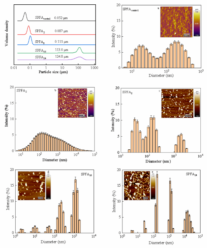 研究表明,在pH=2.0的条件下,SPFA均呈现类似纤维的形态,且随着处理时间的延长,聚集行为呈现出逐渐增强的趋势,粒径逐渐增大。SPFA可以提高淀粉的热稳定性,降低糊化粘度,并延缓淀粉的短期回生。蒸煮条件下形成的PS-SPFA复合物的体外消化性呈现降低趋势,主要归因于:1,SPFA通过在PS表面吸附或包埋形成物理屏障;2,PS与SPFA之间发生非共价相互作用;3,SPFA对α -淀粉酶有混合型竞争抑制作用(后续将详细报道)。研究结果对丰富蛋白调控淀粉消化的作用理论,促进具有抗消化性的营养健康食品开发具有重要意义。