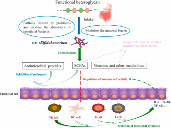 摄入杂多糖能促进双歧杆菌定植,重塑人体肠道菌群。杂多糖不能被人类基因组中编码的酶完全降解,大多数的杂多糖到达大肠中被肠道微生物降解。双歧杆菌属是在人类胃肠道中关键肠道微生物之一,能代谢各种结构复杂的多糖,包括:阿拉伯木聚糖、魔芋葡甘聚糖、n-聚糖、果胶、O-GalNAc聚糖等杂多糖,能够生成短链脂肪酸(SCFAs)、乳酸等代谢产物,有助于双歧杆菌属的定植、调节肠道菌群、增强人体免疫力、减少过敏反应等。然而,双歧杆菌对杂多糖的代谢途径、肠道菌群调节机制和人体健康调节作用尚未明确。