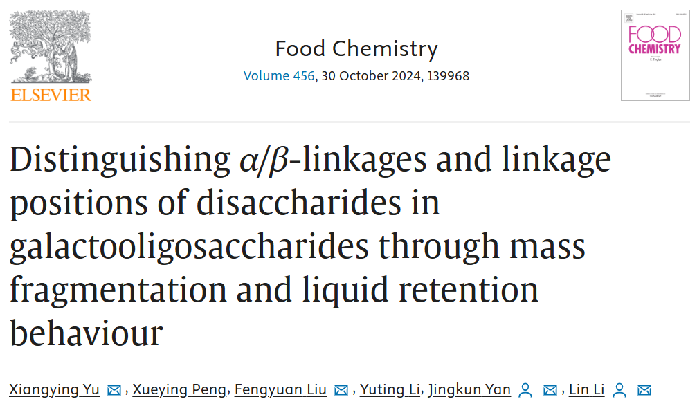 2024年6月4日,公司闫景坤教授团队于国际食品顶级期刊《Food Chemistry》在线发表题为“Distinguishing α/β-linkages and linkage positions of disaccharides in galactooligosaccharides through mass fragmentation and liquid retention behaviour”的研究性文章。论文第一作者为余祥英博士,通讯作者为闫景坤教授。