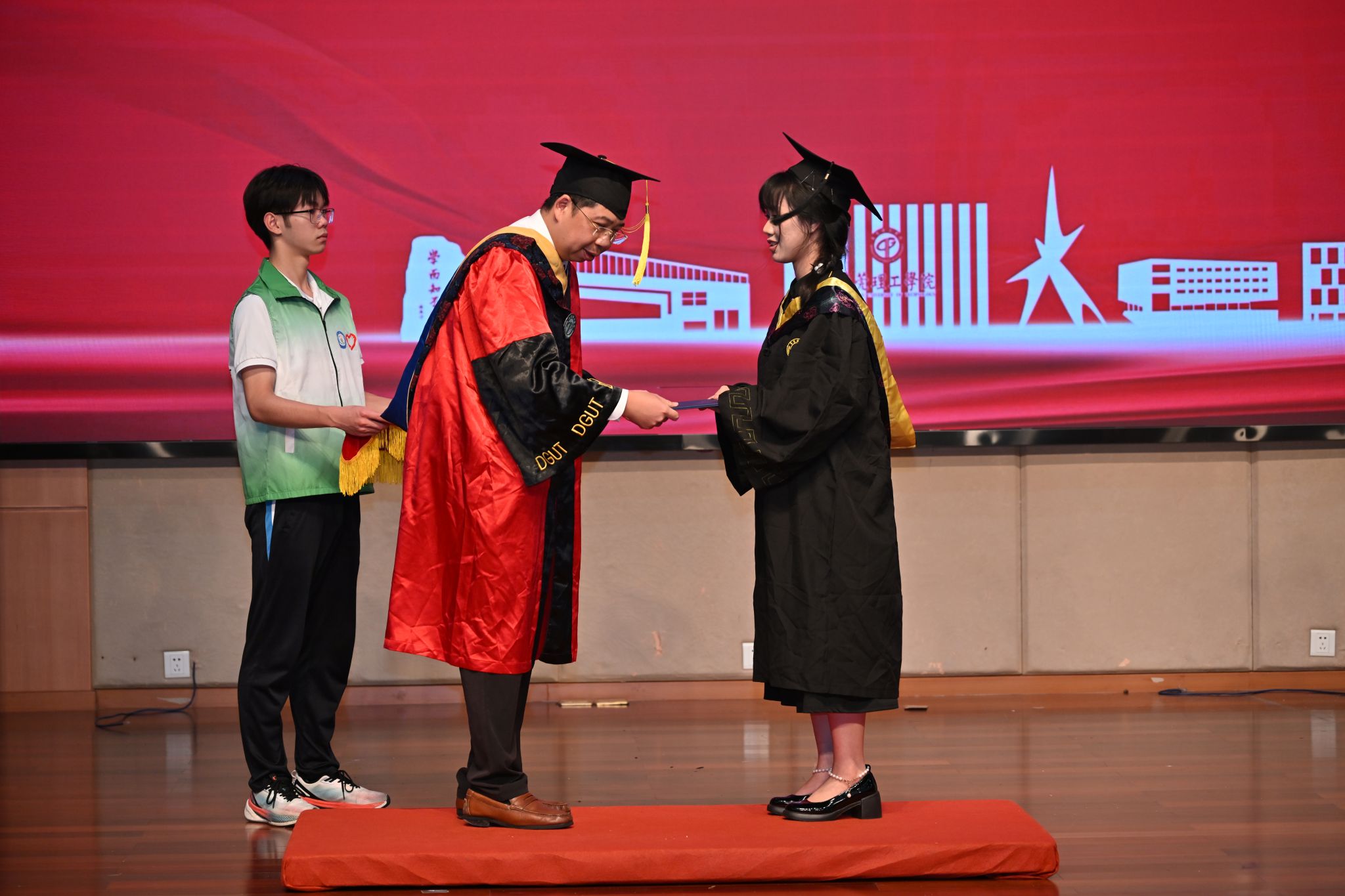 松山湖畔,骊歌悠扬,2025年6月19日,xc体育在松山湖学术会议中心报告厅隆重举行2025届毕业生学位授予仪式。公司经理王际辉、党委书记谢炯标等全体领导班子成员,公司全体教职工及家长代表齐聚一堂,共同见证2025届学子完成学业、开启人生新篇章的重要时刻。仪式由公司党委副书记葛金虎主持。