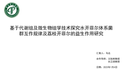 马达博士围绕《基于代谢组及微生物组学技术探究水开菲尔体系菌群互作规律及荔枝开菲尔的益生作用研究》开展研究。水开菲尔在国内主要集中于家庭生产,解决其发酵剂——“水开菲尔粒”的成团机理与发酵体系中的菌群互作规律是水开菲尔工业化的基础问题。拥有优秀可塑性的水开菲尔粒可应用于生产多种发酵果汁饮品,荔枝的高糖度特点能使其成为开菲尔粒优秀的发酵基质,水开菲尔粒产酸、产气的特点可以为荔枝汁的口感进行改良,与此同时荔枝汁经由水开菲尔粒发酵产生的有机酸等活性物质很可能为荔枝产品赋予新的健康标签。