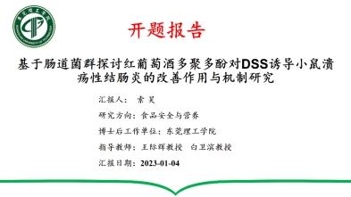 索昊博士就《基于肠道菌群探讨红葡萄酒多聚多酚对DSS诱导小鼠溃疡性结肠炎的改善作用与机制研究》进行了报告。红葡萄酒中存在结构组成复杂的成分—多聚多酚(HPPCs),在索浩博士前期的研究表明HPPCs可抵抗胃肠消化,而进入结肠中,与肠道菌群互作,发挥类似于茶褐素、植物多糖或抗性淀粉所呈现出的益生元增效功能作用。该课题通过葡聚糖硫酸钠(DSS)诱导小鼠UC模型,拟评价HPPCs对 UC 的缓解改善作用效果,并探究其对炎症与氧化应激相关信号通路、肠道菌群稳态及血清代谢产物水平的影响,阐明相关保护作用机制。