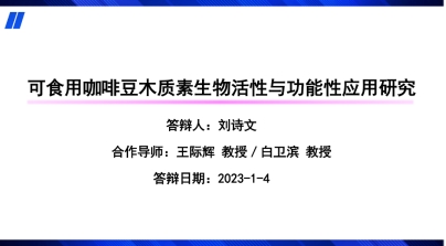 开题会上3位博士就自己的研究课题进行了详细的汇报。刘诗文博士针对《可食用咖啡豆木质素生物活性与功能性应用研究》进行了报告。木质素是一种无定型的三维网状聚合物,目前,大多数的商业木质素是作为造纸工业中的副产品生产的,实际上木质素在生物和医学方面也有相关的研究进展。该课题意在分析云南小粒咖啡豆来源木质素的结构,探究其在生物医学方面的作用,对提高木质素在商业中的价值具有重要意义。