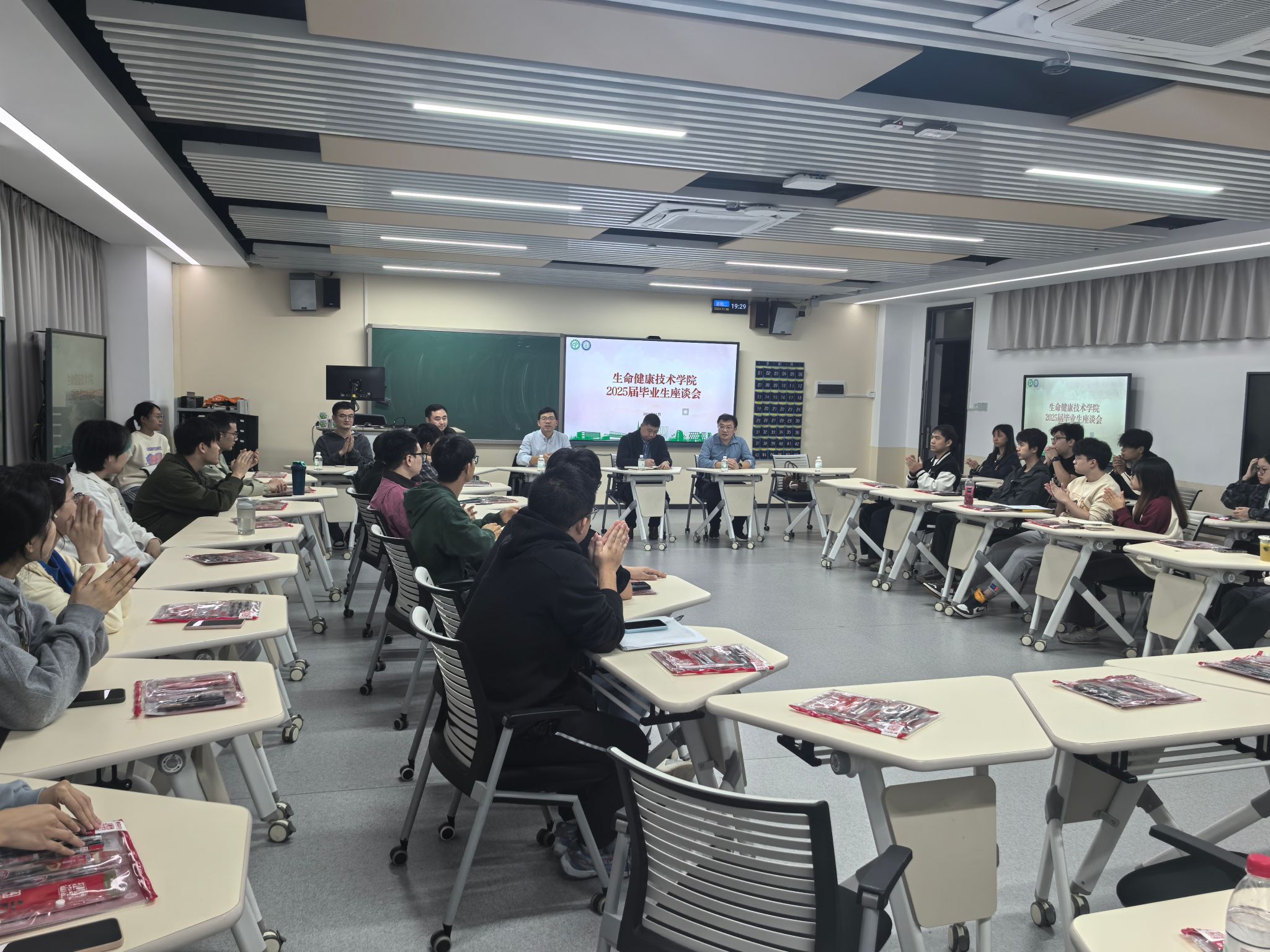 为进一步了解2025届毕业生的在校学习生活情况,掌握同学们的就业现状及期望需求,提高工作针对性,xc体育于11月26日晚在6D303举行2025届毕业生座谈会。公司党委书记谢炯标,党委副书记葛金虎,副经理闫景坤,营养与健康系主任刘宇佳,辅导员杨梅青、刘文渊及2025届毕业生参加此次座谈会。